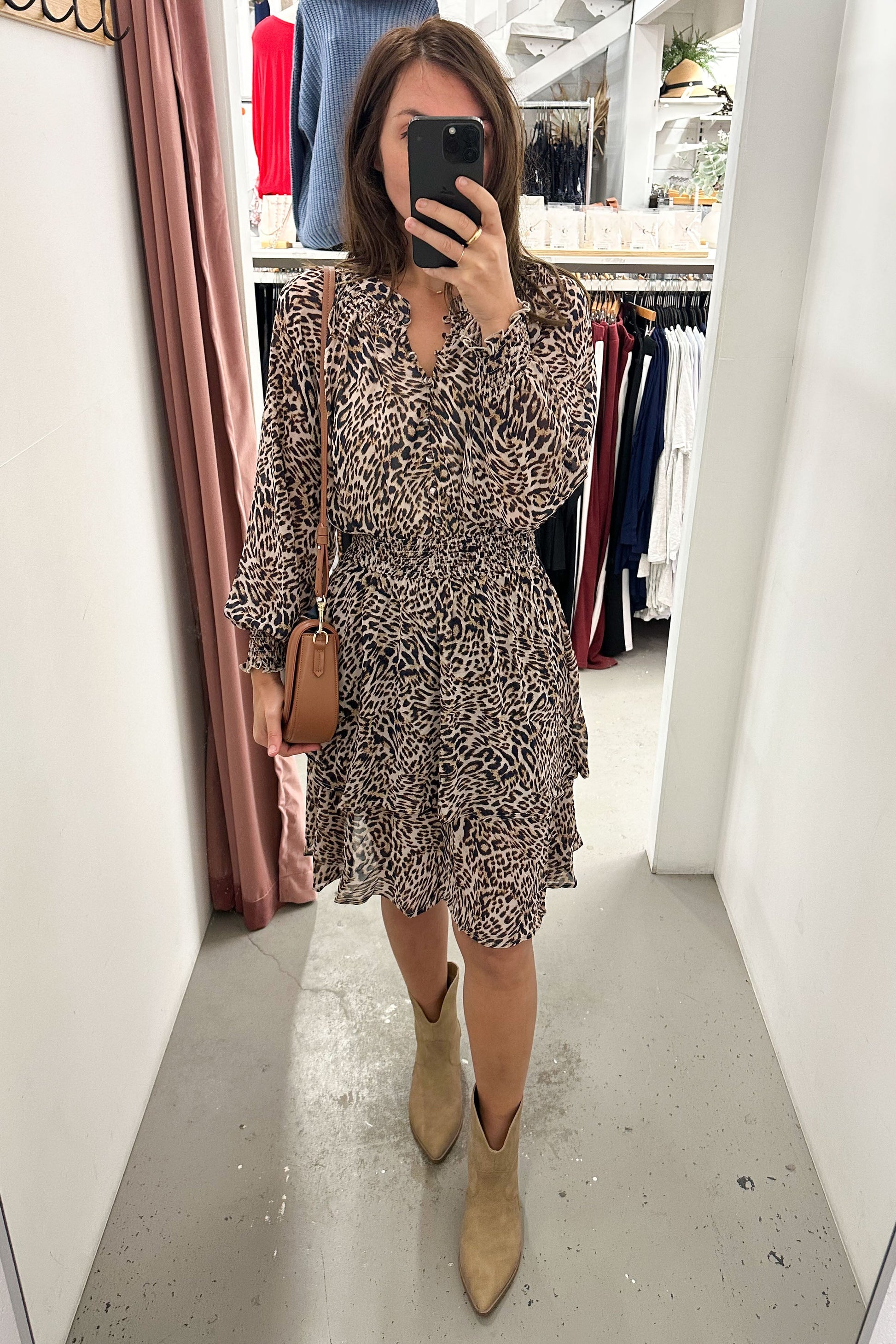 This flirty leopard print dress is the perfect mix of fun and effortless. The waist is stretchy and with the floaty silhouette, and ruffled skirt, it compliments all the right places while keeping you comfortable. The elastic sleeves and functional buttons add a touch of ease, making it simple to dress up
